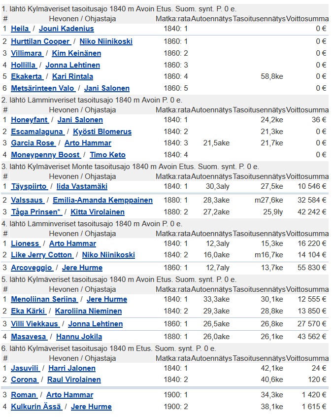 Harjoitusravien lähtölistat la 12.7.
